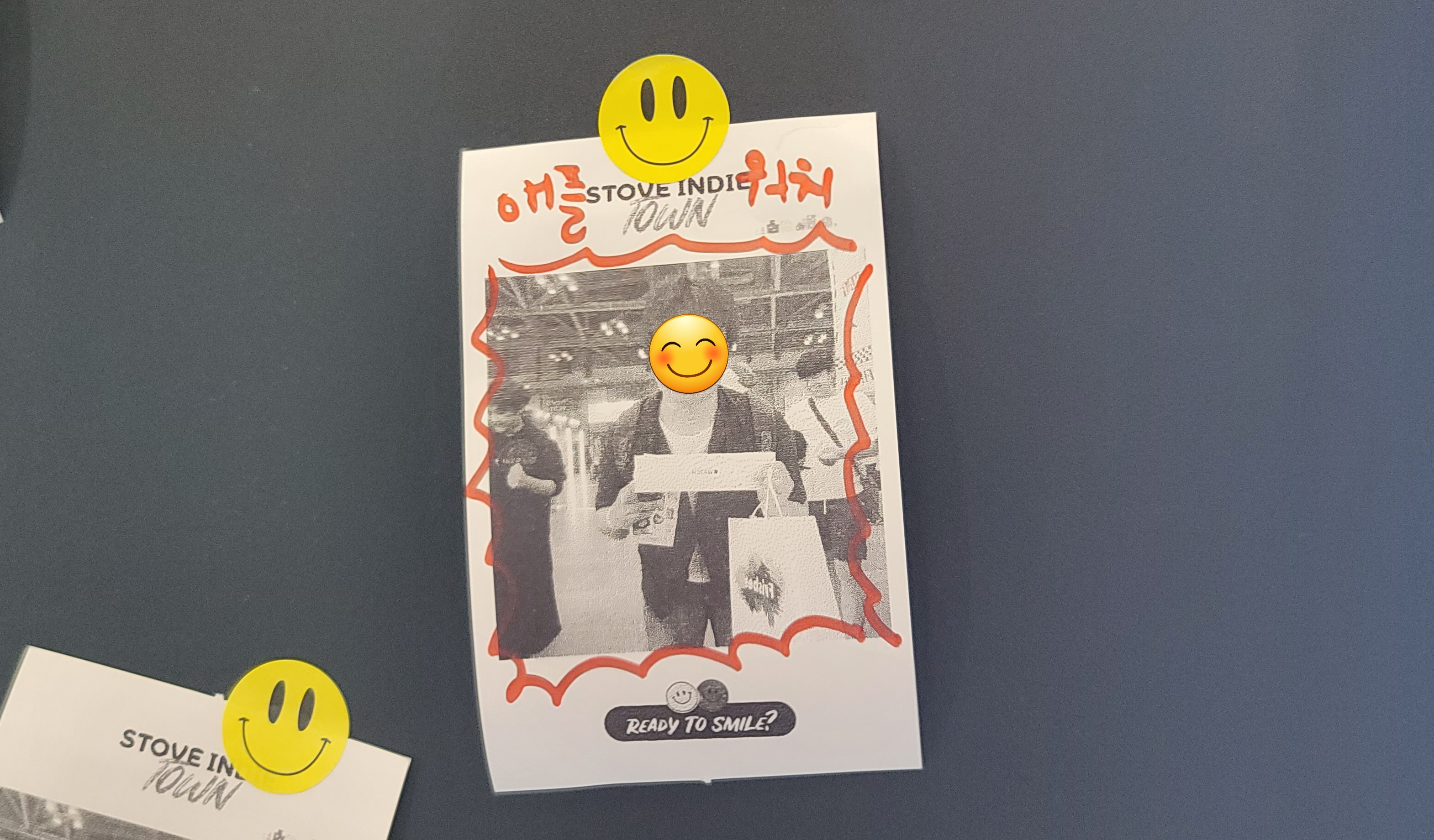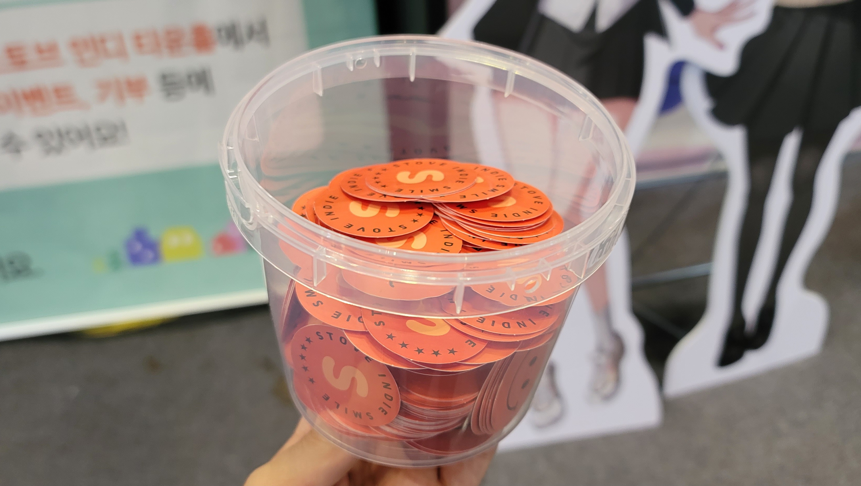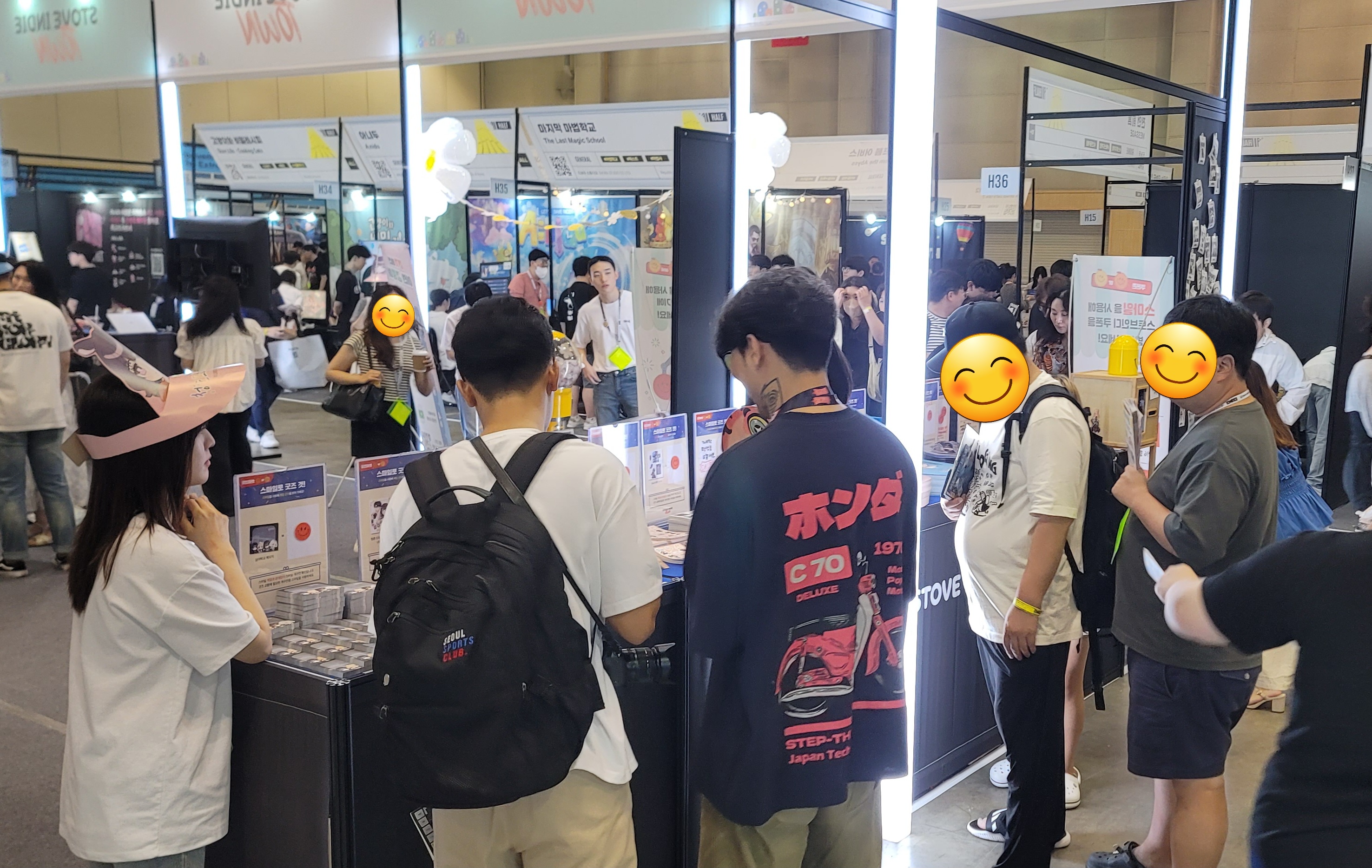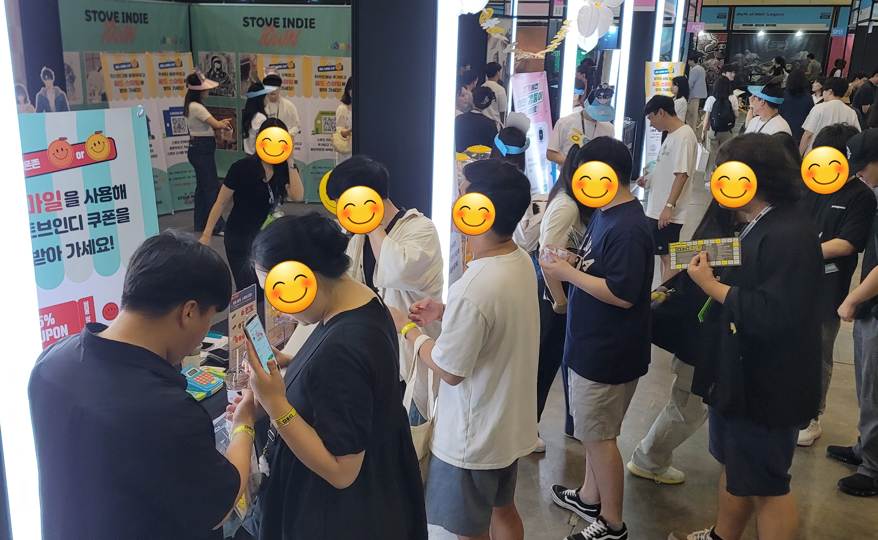 스토브인디 부스에서 골드 스마일, 스마일 스팟에서 오렌지 스마일을 모아오신 분들이 어떤 굿즈와 교환할까 고민 중이시네요