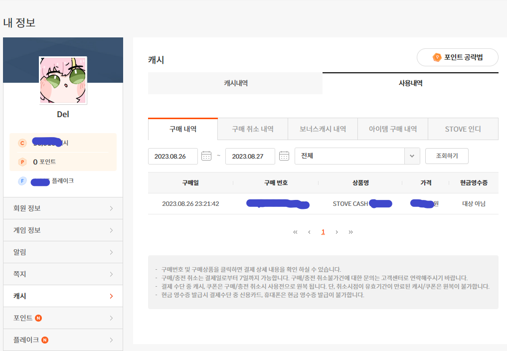 캐시를 충전했습니다.