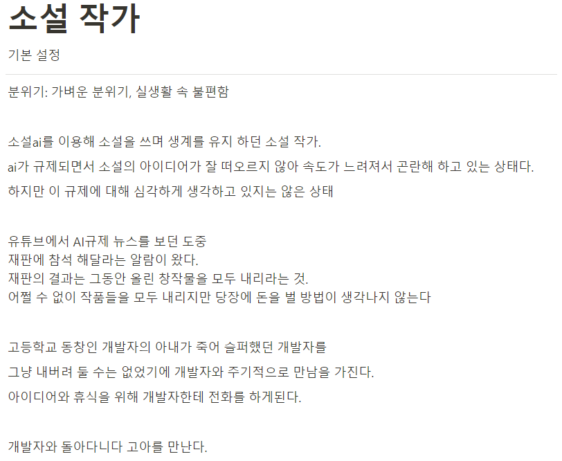 밑의 사진은 저희가 다룬 소설 작가 역할의 기본 설정이 담겨 있는 문서의 사진입니다.