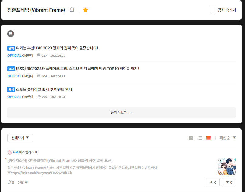 텀블벅 사전 알림 오픈과 동시에 스토브 커뮤니티에 청춘 프레임 신규 개설!