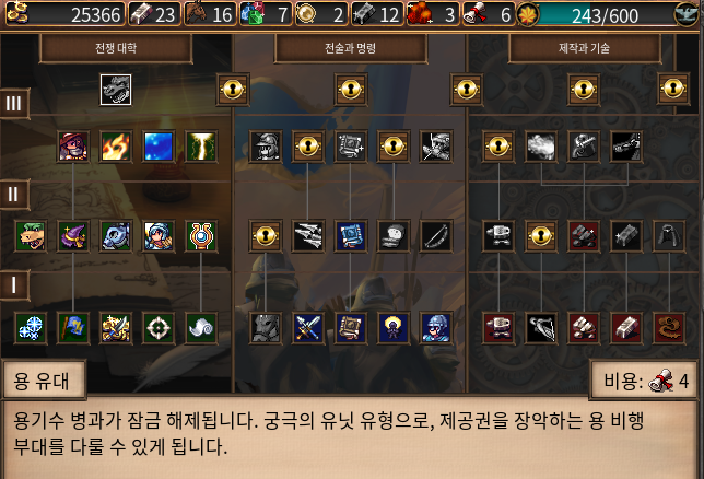 마법사와 용을 재대로 쓰기 위해서는 마법 대학 태크 트리를 높여야 하는데 마법 대학 트리는 영향을 주는 병종이 적어서 효율이 안 좋습니다. 하지만 초반부터 마법 대학 트리를 올려서 10장 전후로 마법 대학을 다 올리면 마법사의 강력한 화력으로 쉽게 진행할 수 있습니다.