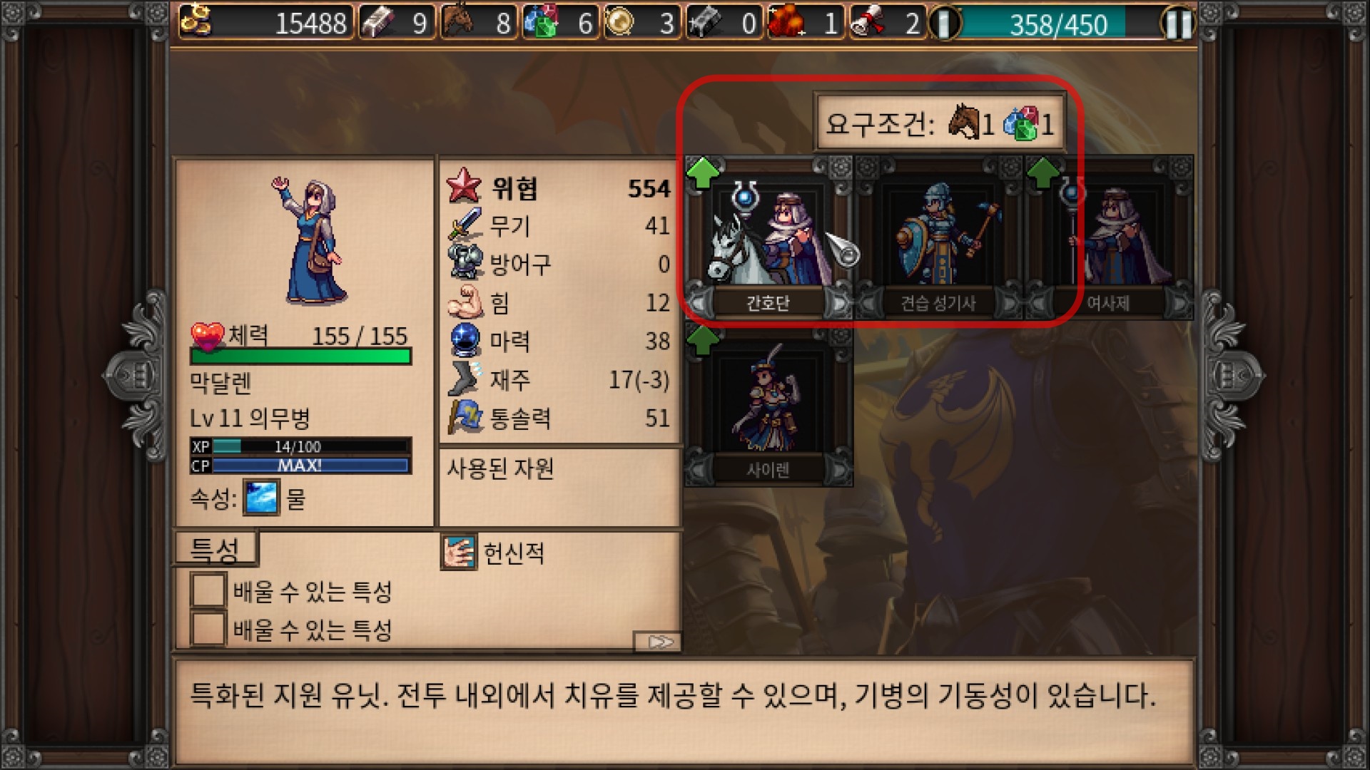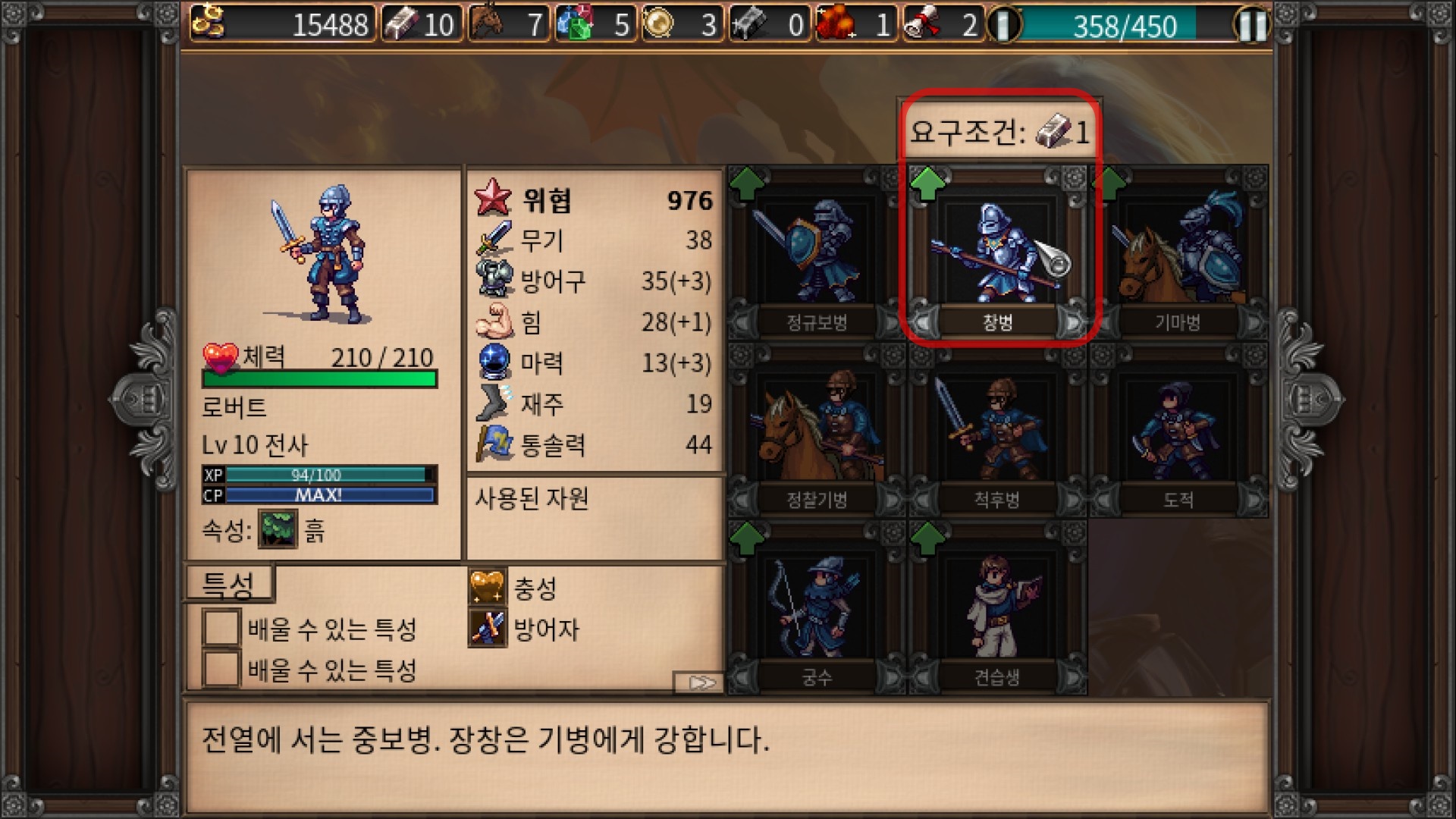 적도 기병으로 아군을 공격하는데 이 기병을 막기 위해서 필요한 것이 창병입니다. 창병은 보병(전사)을 병과 변경 시 창병으로 바꿀 수 있습니다. 그리고 의무병을 병과 변경 시켜 간호단(의무병+ 기병)으로 전직할 수 있습니다.