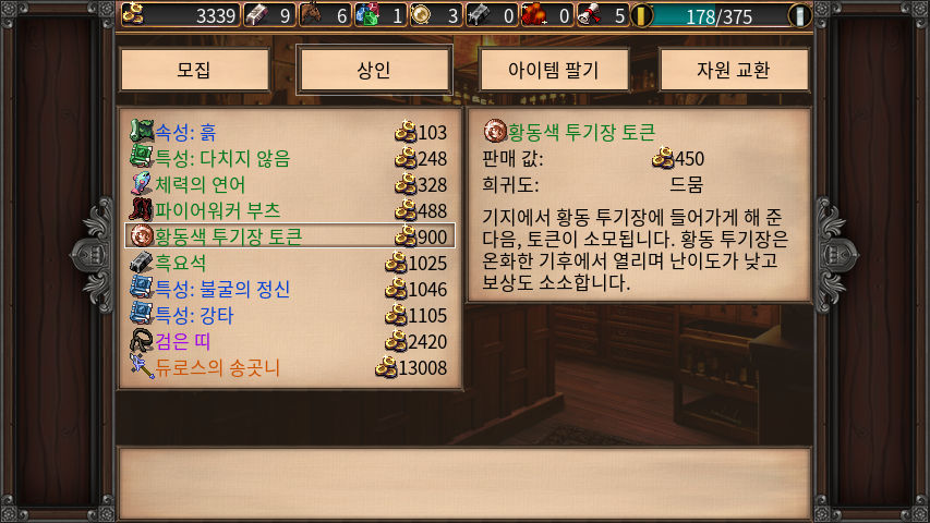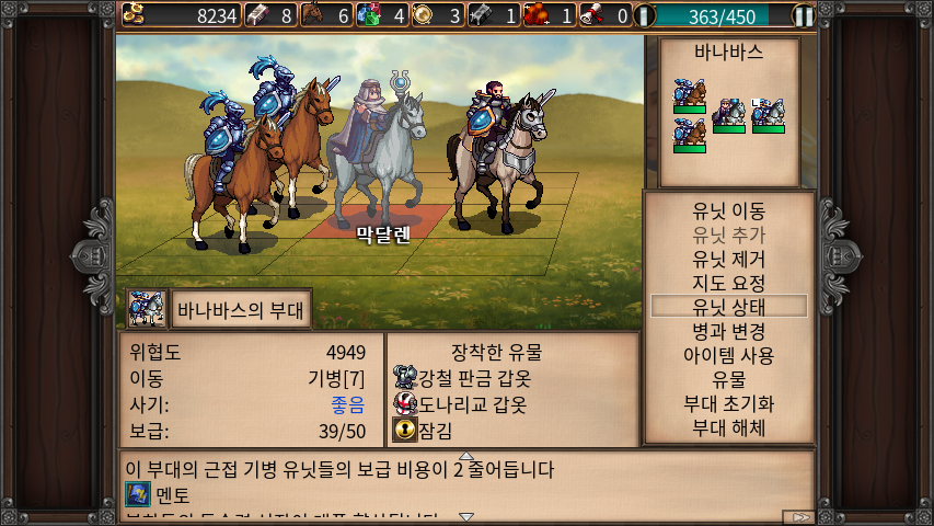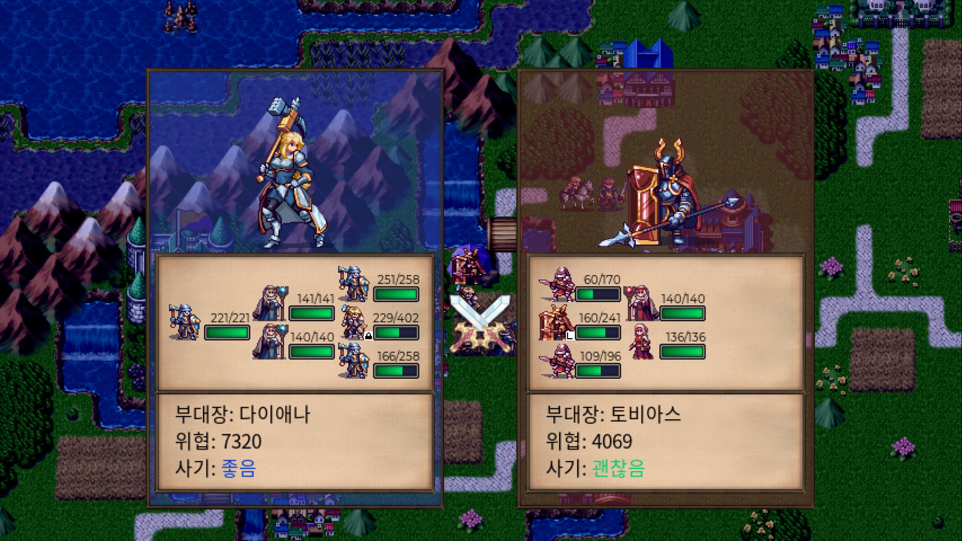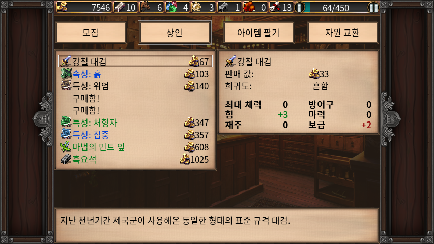 상점에서 파는 장비들을 잘 이용하면 난이도가 많이 내려가니 원하는 물건이 없다면 한 번쯤 로드해서 다시 해보시기 바랍니다. 저의 경우 강철 대검을 많이 썼는데 낮은 가격에 공격력을 3이나 올려줘서 나올 때마다 사서 거의 모든 부대장들에게 장비 시켰습니다.