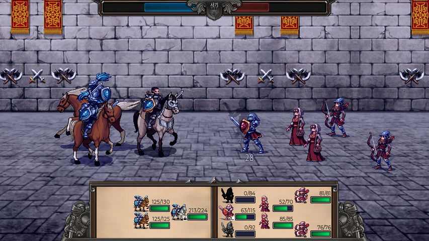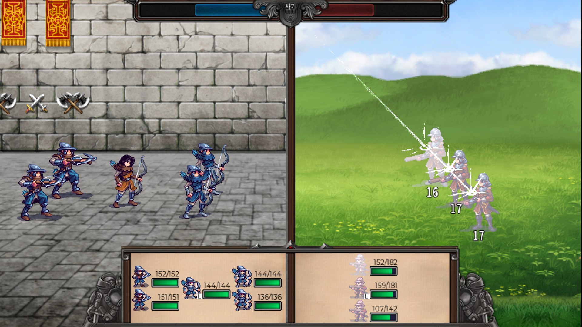 두 번째로 보조 병과(마법사&힐러)를 공격할 수 있고 사기를 떨어뜨립니다. 적 부대 전체를 랜덤으로 공격하지만 여러 번 공격하다 보면 보조 병과 한둘은 없앨 수 있고, 계속 궁수의 공격을 받으면 사기가 조금씩 떨어집니다.