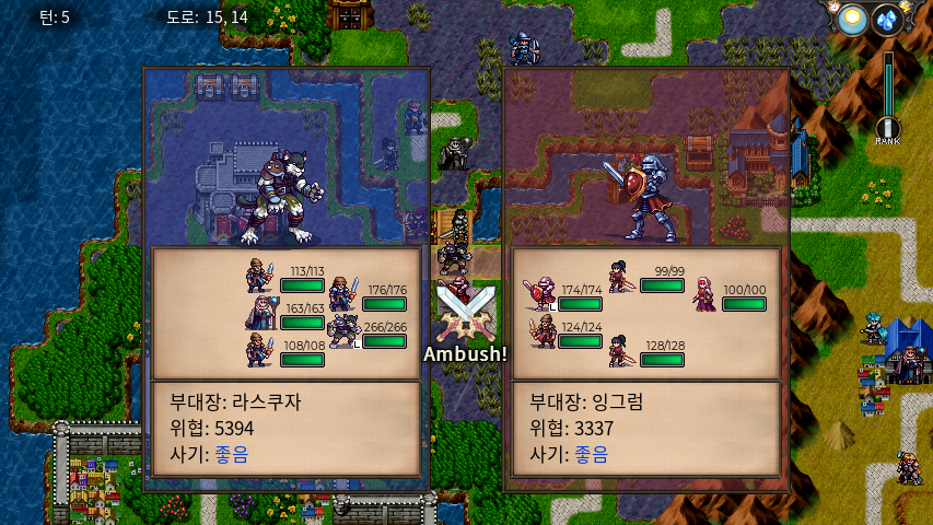 마지막으로 경보병 만으로 이루어진 부대가 이동 제약이 있는 타일(예 : 숲 또는 늪지)에서 적의 측면 또는 후방을 공격할 때 기습 판정이 뜹니다. 기습은 적의 반격 한 번을 스킵 하기 때문에 상대적으로 안전하게 공격할 수 있습니다.