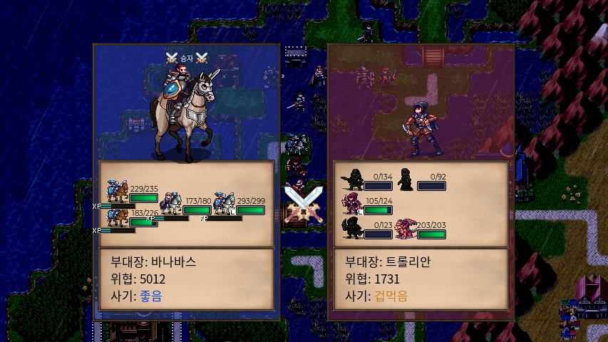 삼국지 조조전, 파이어 엠블렘, 슈퍼로봇대전 같은 작품을 해보았다면 비슷한 전략으로 싸옵니다. 조조전을 에로 들자면 궁수가 떨어진 적을 견제하고 접근한 적은 방패든 보병이 막고 기병이 결정타를 때리는 식으로 전투가 진행됩니다.