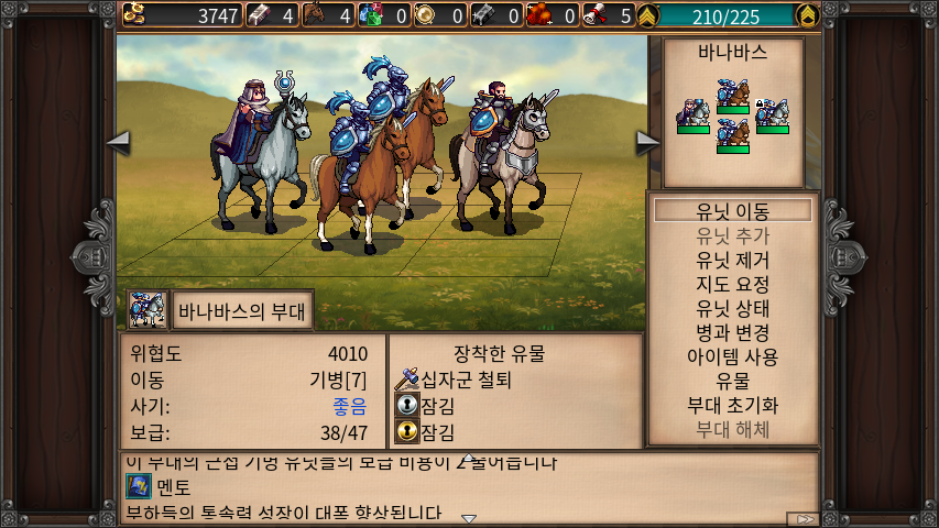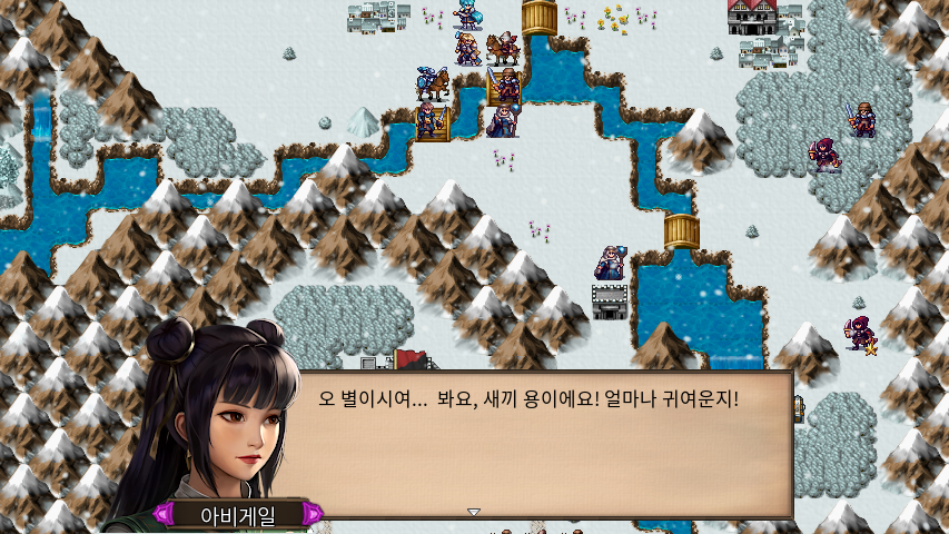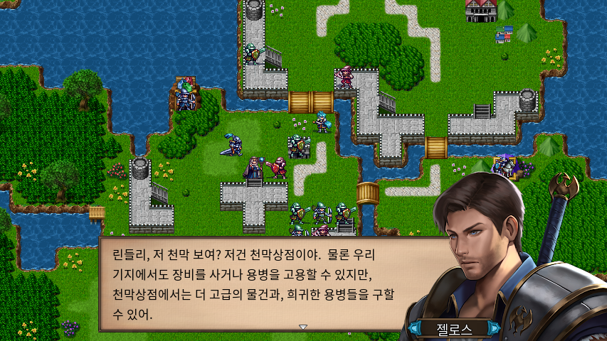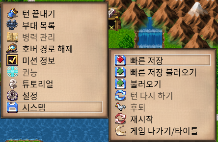 1장은 젤로스의 조언을 따라서 진행하면 는데 알아두어야 할 것은 시스템 메뉴에서 [빠른 저장]과 [턴 다시 하기]입니다. 이제부터 전투 결과가 마음에 안 들거나 실수를 했을 때 자주 사용하게 될 옵션이니까 기억해 둡시다.