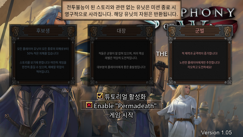 *. Ebable "Permadath" 옵션은 전투 불능이 된 병사를 게임에서 제거하는 옵션인데 이것은 옛 파이어 엠블렘 같은 느낌으로 플레이하려는 유저를 위해서 제공하는.옵션입니다. 왠만하면 꺼둘 것을 권합니다. *. 디폴트( [X] )가 꺼짐 상태 입니다.