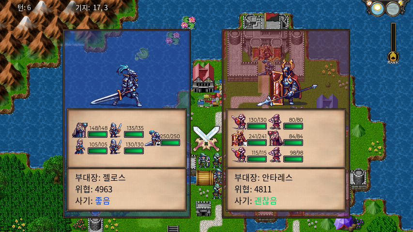 적의 성은 창병 부대가 지키고 있으니 궁수로 HP를 떨구고 젤로스 부대로 창병들을 제거하는 방식으로 싸웠습니다.