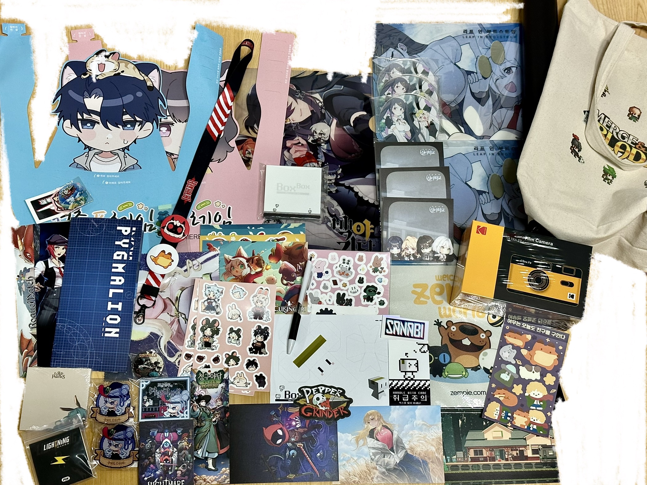 산 물품+게임부스 돌아다니면서 받은 굿즈들입니다