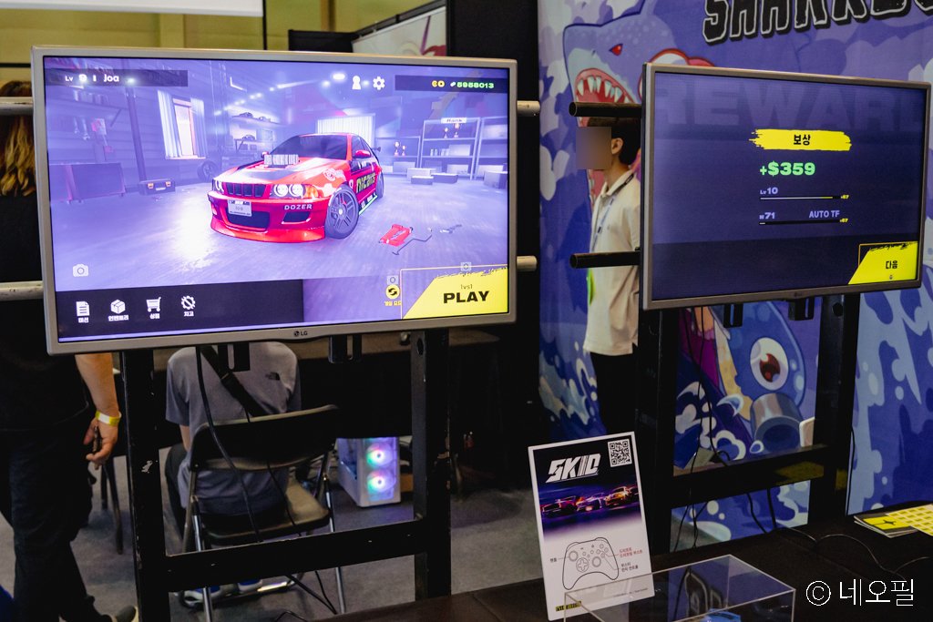 행사장에 입장하자마자 2인용을 지원하길래 가볍게 해본 캐주얼 레이싱 게임입니다. 코너 구간에서 타이밍에 맞춰 버튼을 누르면 드리프트가 발동되는 시스템이 대표적이었는데, 전체적으로 조작감이 무난해서 몸풀기 접대용으로 괜찮겠다는 생각이 들었습니다.