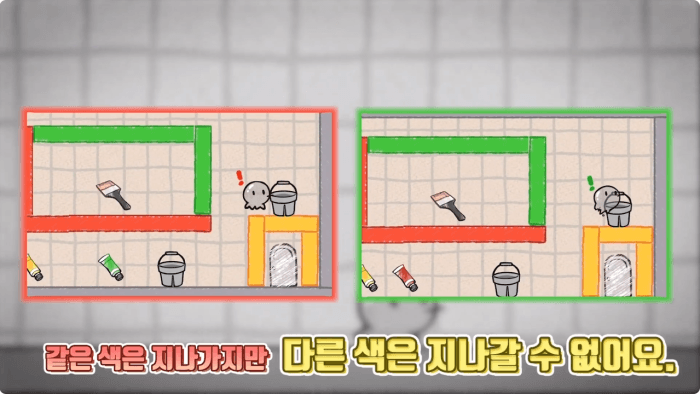 슬라임처럼 생긴 캐릭터의 몸 색깔을 바꿔가면서 같은 색깔의 벽을 통과하고, 붓을 먹어서 문을 연 다음, 그 문으로 나가면 클리어하는 퍼즐게임입니다. 아무 생각 없이 진행하면 색깔이 맞지 않아 갇혀버리거나 다음으로 진행할 수 없기 때문에 서순을 잘 생각해야 해요.