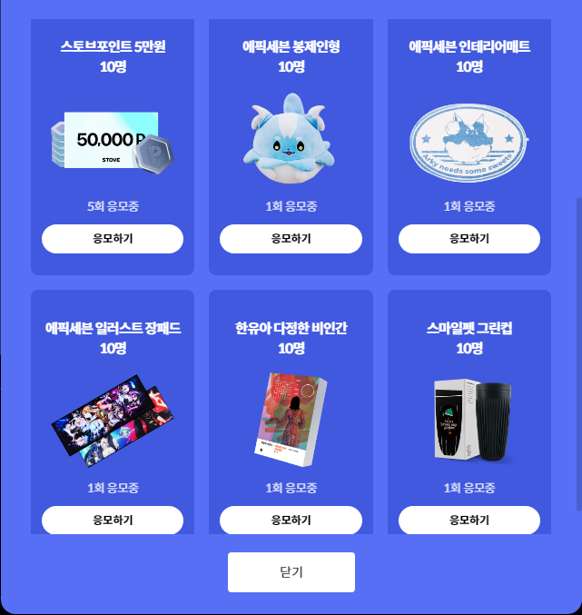 노트북부터 스토브 5만원권까지는 응모수가 1000이 넘어가더군요..