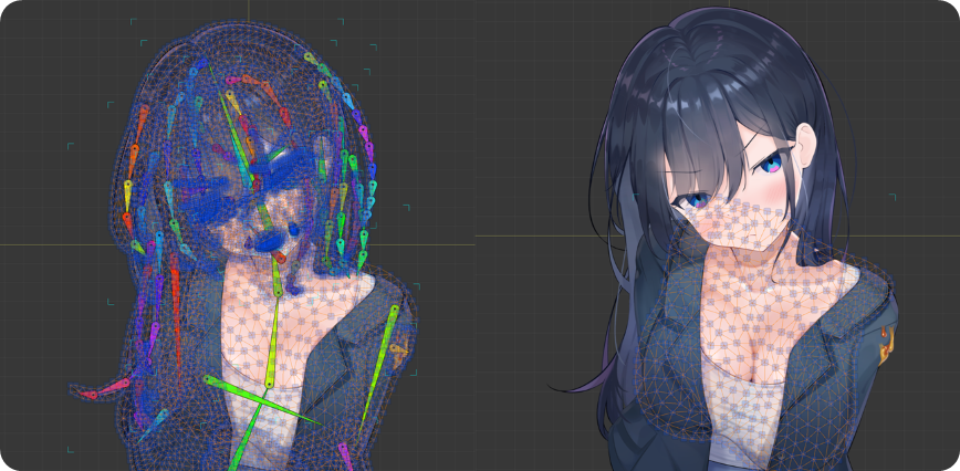 2D 캐릭터에 메쉬&리깅을 적용하여, 고개, 동공, 포즈 등이 생동감 있게 움직이도록 제작하였습니다.