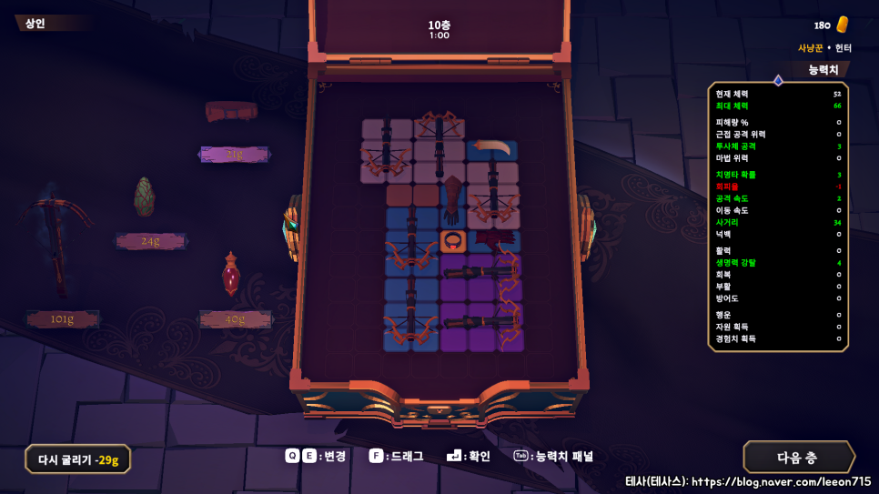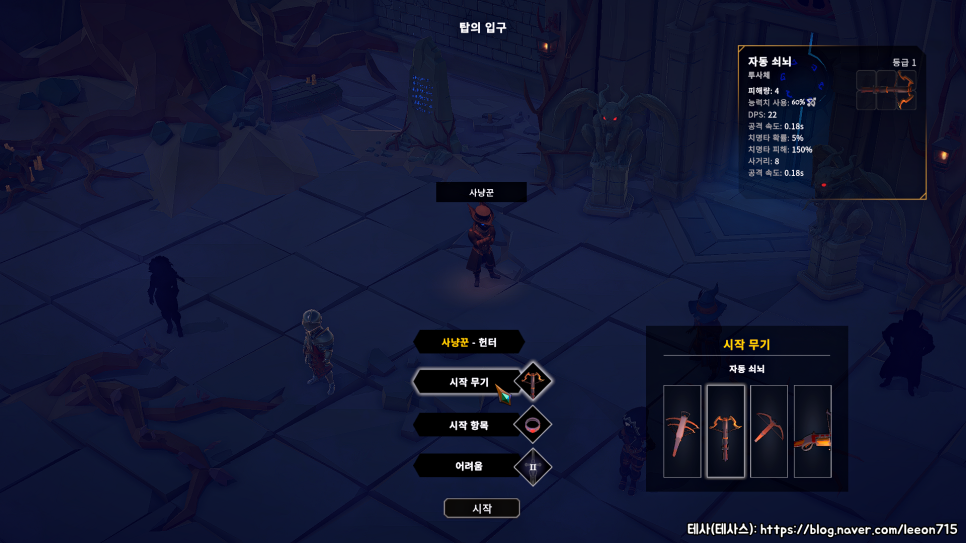 자동 쇠뇌: 공격 속도는 빠르지만 공격력이 낮습니다. 그래서 초기에 몬스터를 잘 못 잡을 염려가 꽤 있어서 저는 비추입니다.