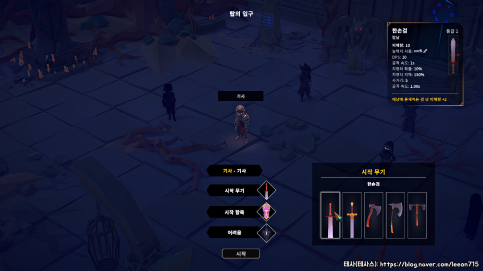 한손검: 밸런스가 고루 잘 갖춰진 무기. 적당한 부피와 공격력을 갖고 있습니다. 또한 배낭에 존재하는 검 당 피해량 증가가 있어 중반까지 보기에도 괜찮습니다.