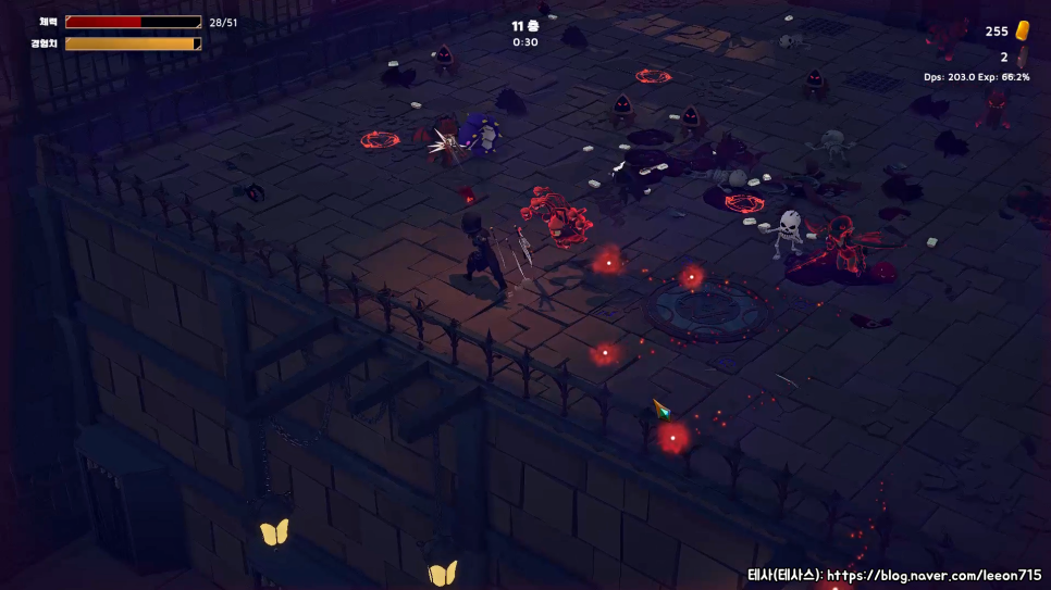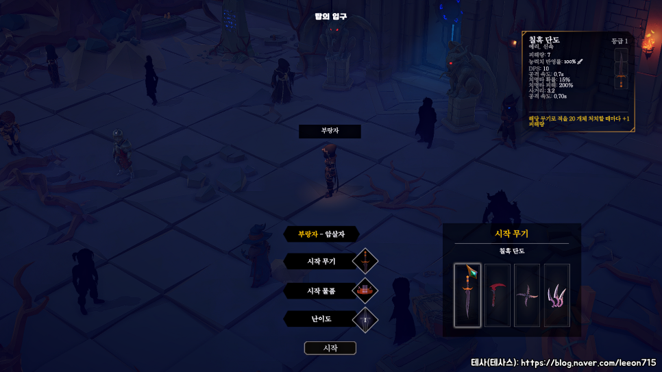 거리 조절만 잘 되면 초반부터 정예 때려잡기에는 최적화된 직업입니다. 하지만 기본적으로 사거리가 매우 짧은 편이라서 운영 난이도가 매우 높습니다. 그래서 가장 먼저 사거리 관련 아이템들을 넣어주셔야 하고요. 근접 전투가 어렵다면 무기고에서 빠르게 투척 단도를 해금하는 것을 추천드립니다.