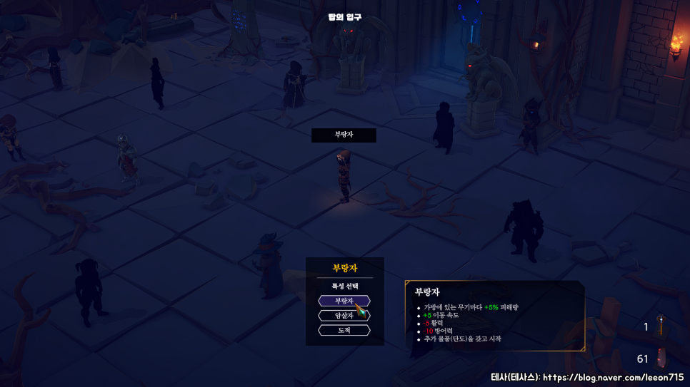 개인적으로 입문 난이도만 놓고 보면 암살자 특성을 추천드립니다. 어차피 예리에 관련한 버프는 비슷비슷한 편이에요. 그러면 조금이라도 편의성이 올라가는 특성을 구해야 하는데... 초근접전을 해야 하는 부랑자에게는 사거리 옵션이 붙어있는 것이 좋거든요.