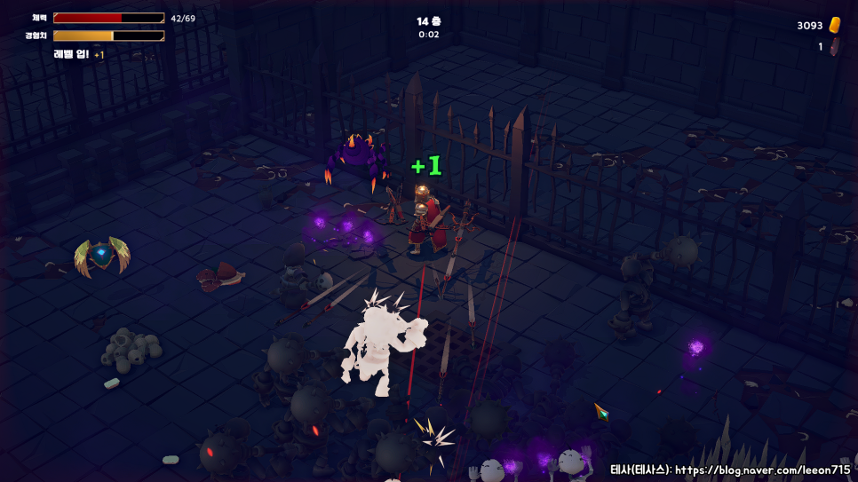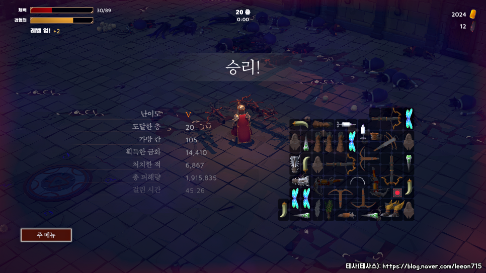 2. 근접 공격력/원거리 공격력 스텟, 경험치 및 자원 획득 스텟을 챙겨줍니다. 이 때 흡혈 아이템도 2개 정도 구해두시면 안전하게 파밍이 가능합니다.