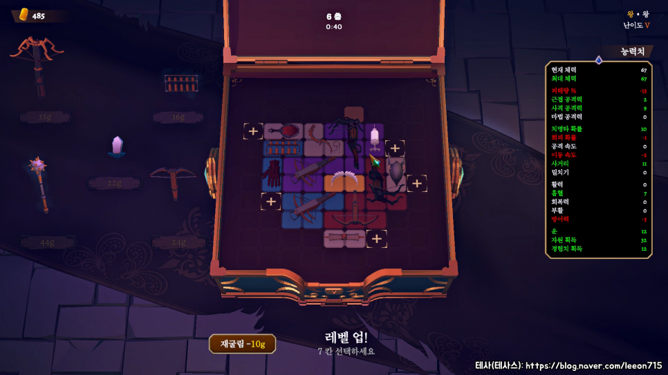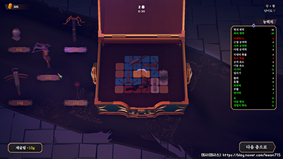 4. 20층 직전에 운 관련 아이템만 모두 팔아버리고, 최종적으로 치명타 확률은 50, 이동 속도는 40~50, 회피 확률은 50 이상, 사거리 30 맞춰주면 됩니다. (피해량은 다다익선)