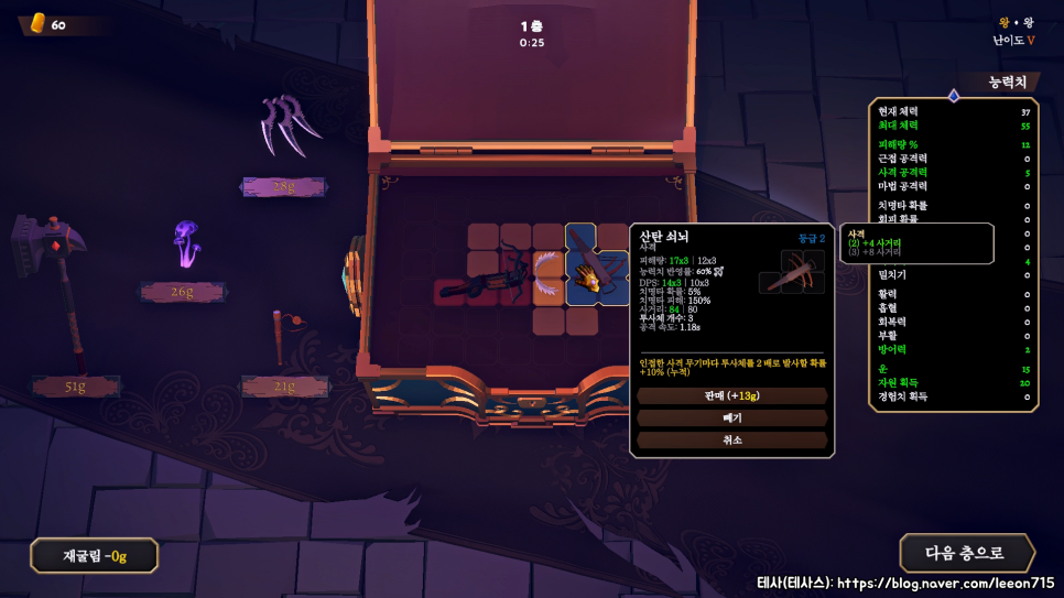 3. 어느 정도 배낭이 다 찼다 싶으면, 회피 확률/이동 속도 관련 아이템과 높은 등급의 무기가 뜰 때까지 상점 재굴림을 해줍니다.