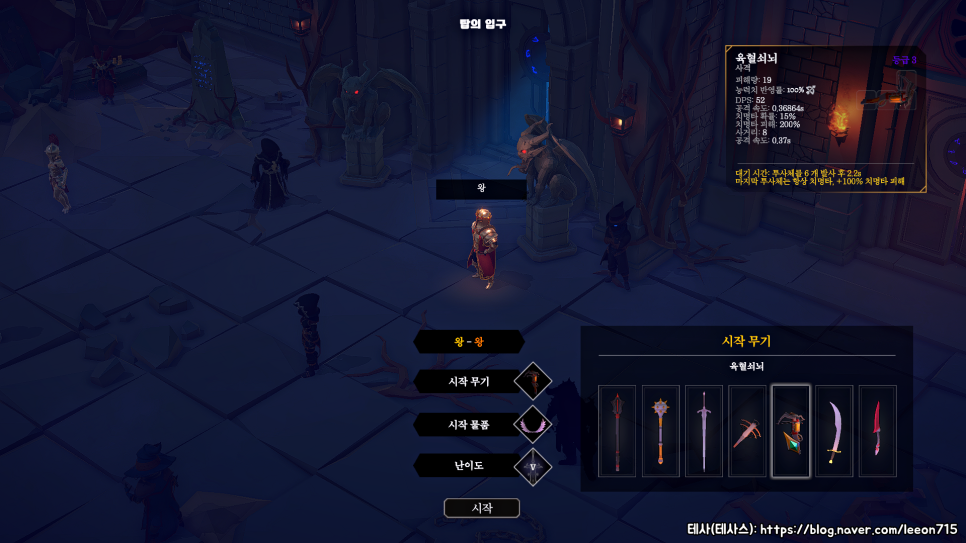갓 오브 웨폰 내의 여러 직업들의 장점을 고루 합쳐놓은 클래스가 왕 아닐까 싶어요. 고대 신의 축복에서 시작 무기 등급을 2증가 시켜놓고 왕 특성을 픽하면 초반부터 4등급 시작 무기를 보유할 수 있습니다. 여기에 왕 특성 버프까지 받아 피해량이 기하급수적으로 올라가죠.