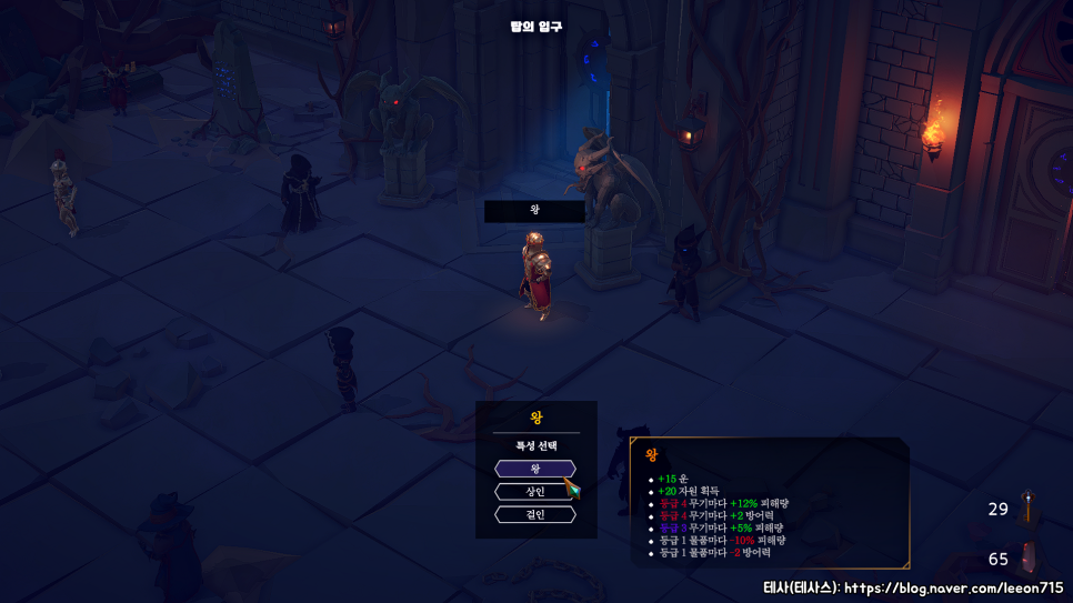 평가: 체력을 이용해 상점에서 아이템을 산다는 컨셉. 재밌긴 하지만 저는 왕 특성이 더 좋다고 봅니다. 이 게임 자체가 제한 시간 안에 적들을 많이 잡아 경험치를 얻어야 하는 구조라 체력 외에 다른 버프가 없다는게 커요. 어차피 활력을 높이더라도 흡혈이나 회복력, 방어력과 같은 스텟에 투자해야 되는건 매한가지라 그렇게 밸류값이 좋다고 볼 순 없습니다.