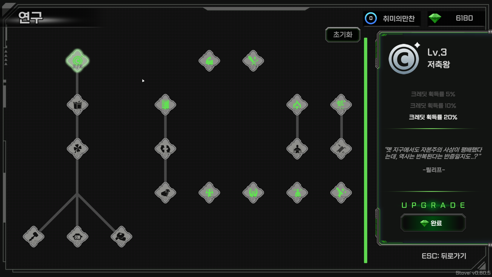 로그라이트 장르인 만큼 클리어를 하지 못하고 나와도 기본 스탯 강화를 할 수 있는 "연구"가 존재합니다.