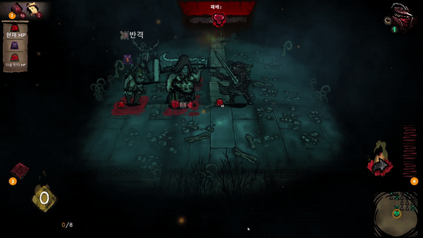 보스는 보스와 동일한 줄에 있을 때 75% 확률로 분노의 한방이라는 패시브 공격을 합니다. 그래서 공격이 끝난 뒤에는 대각선 위치로 이동해야 보스에게 공격당하는 것을 피할 수 있습니다.