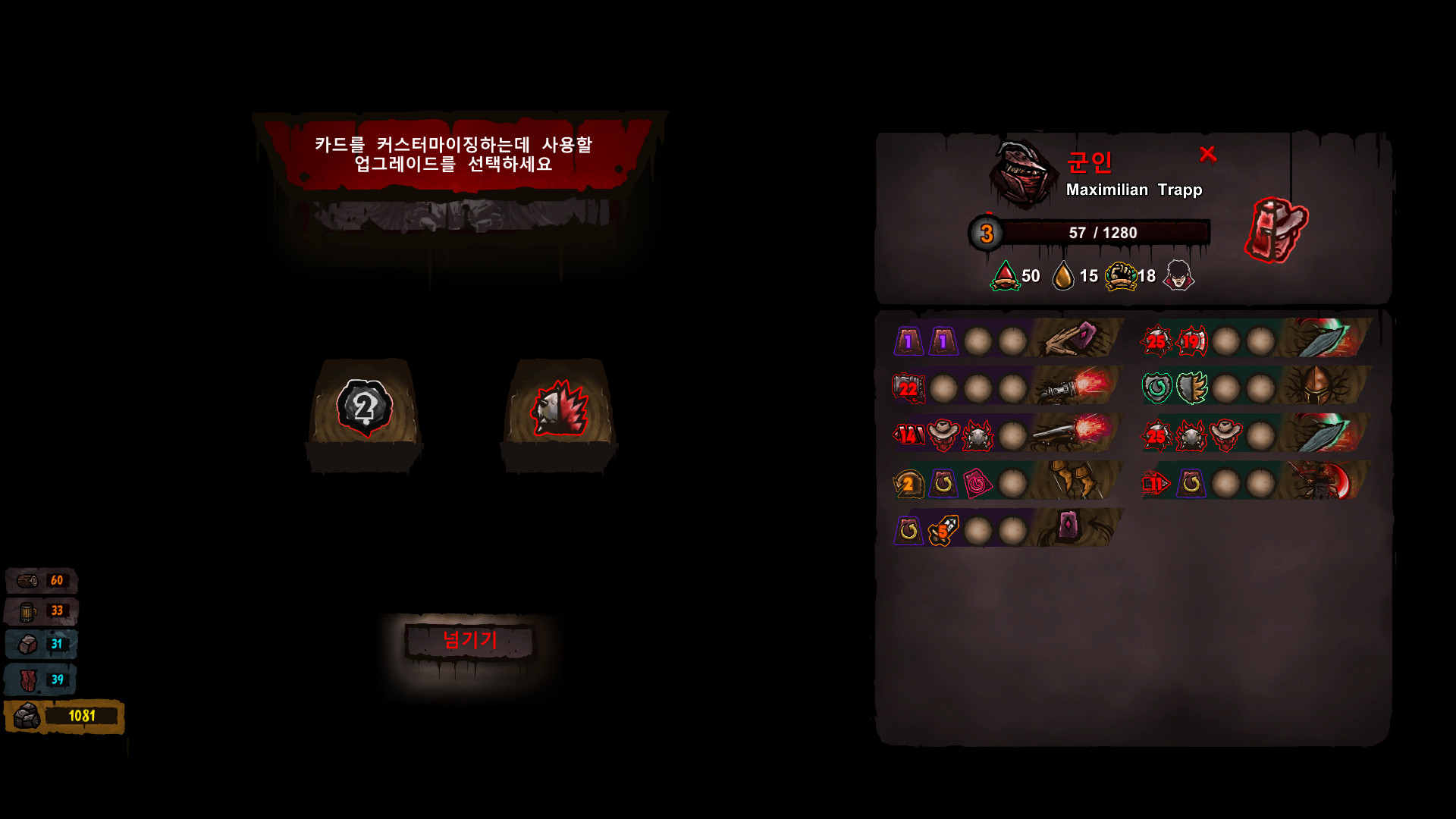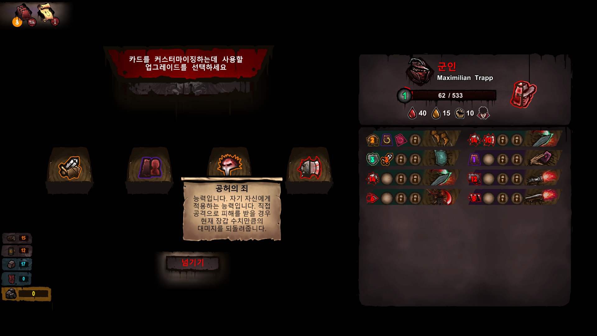 첫 번째 보스를 쓰러뜨리려면 어느 정도 카드 강화가 필수인데 개인적으로 권하는 카드 조합과 강화는 직접 공격 카드, 강화 업그레이드는 공격 카드에 붙이는 조건이 붇지 않은 공격력 강화 위주로 할 것을 권합니다.