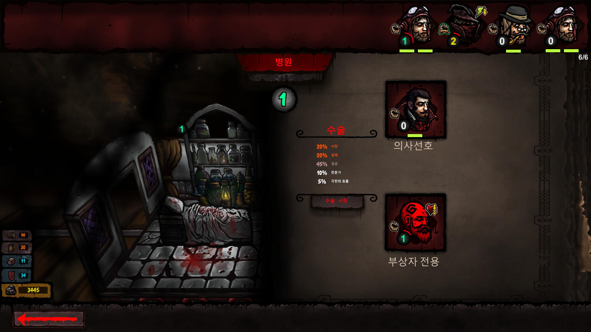 시설물 활용 시 일정 확률로 사고가 나거나 또는 미궁에서 탈출하면 대원은 다쳐서 돌아옵니다. 의사가 환자를 치료할 수 있긴 한데 운이 나쁘면 치명적인 부상 상태가 되고 이 상태에서 또 실수하면 사망합니다.