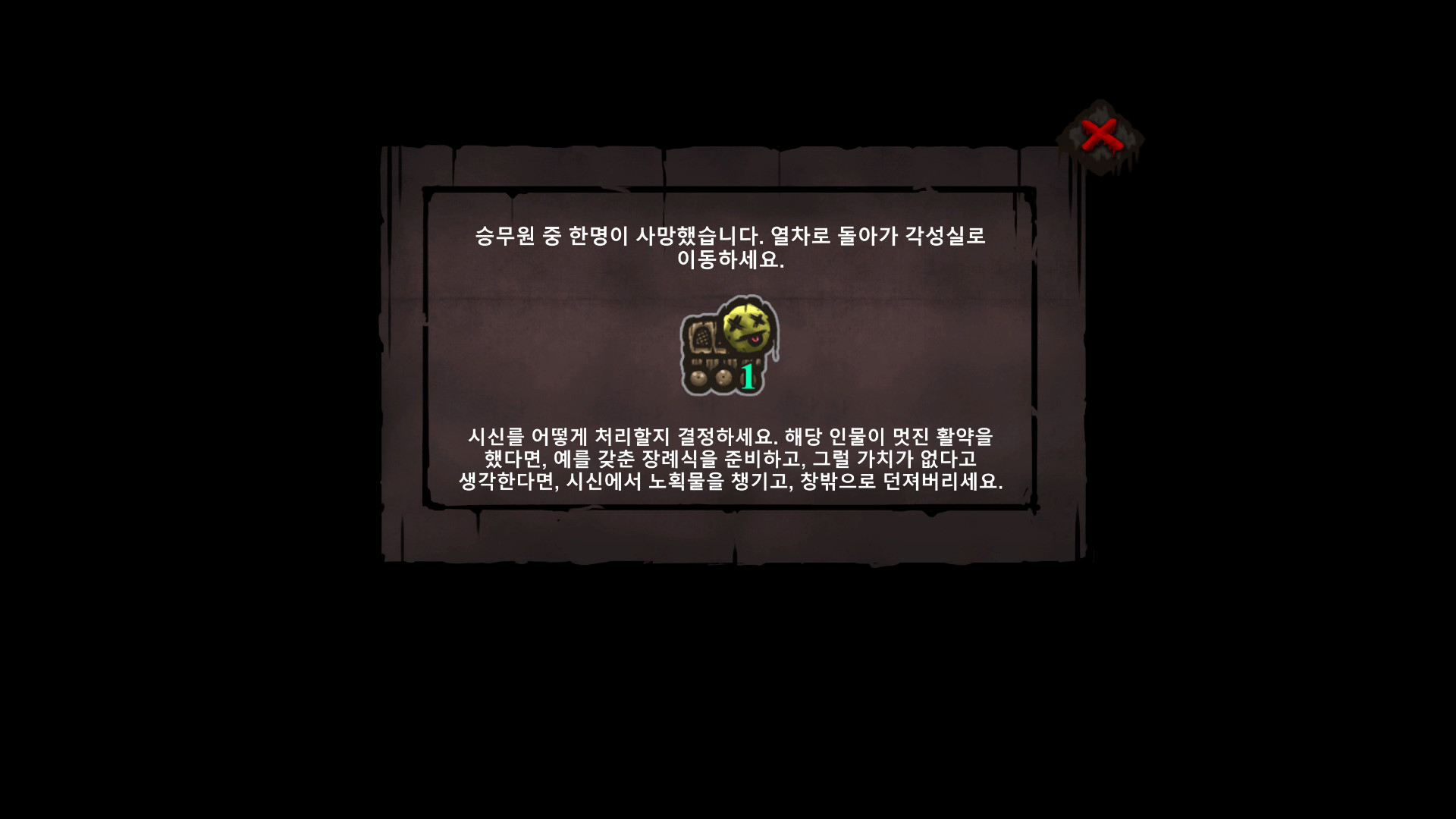 각성실은 1000개를 들여 사망한 대원의 장례를 치르는 시설입니다. 장례를 치르면 랜덤으로 대원 3명이 장례에 참석하고 장례에 참석한 대원의 능력이 상승합니다.