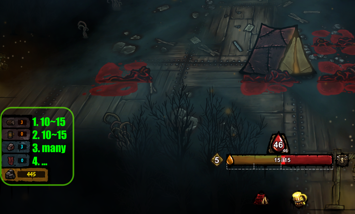 정신력이 심하게 떨어지면 적에게 첫 턴을 빼앗기고 싸우게 되는데 그럼 전투 난이도가 크게 올라갑니다. 텐트에서 쉬기 위해서는 나무 6개 가 필요하니 여유 분량까지 합쳐서 10~15개 정도는 미리 확보해 둘 것을 권합니다.
