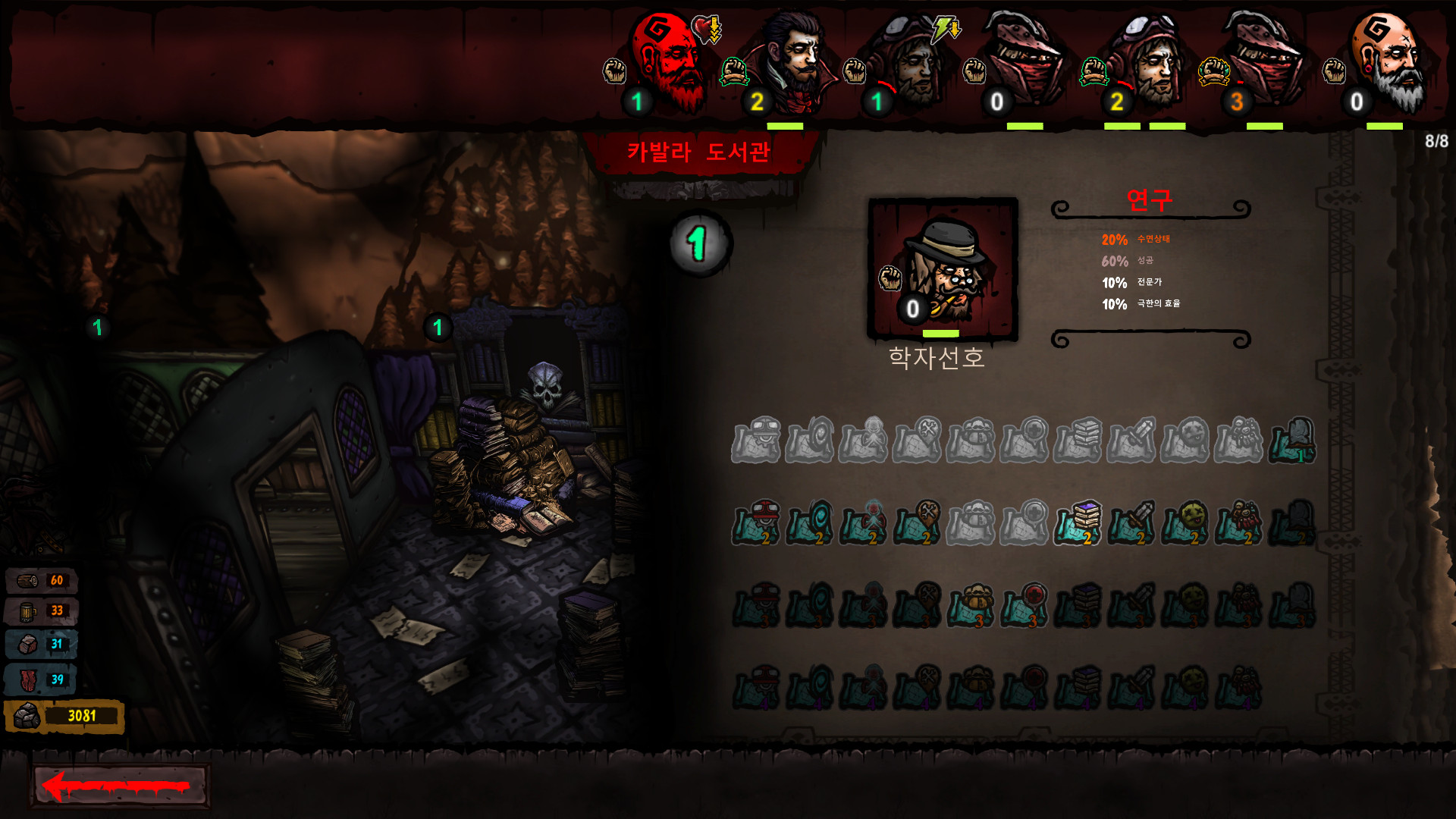 도서관은 마수의 혀를 재료로 해서 시설을 연구합니다. 학자가 아닐 경우 실패 확률이 35%까지 증가하고 학자의 레벨이 올라가면 20% 에서 실패 확률이 2%씩 떨어집니다.