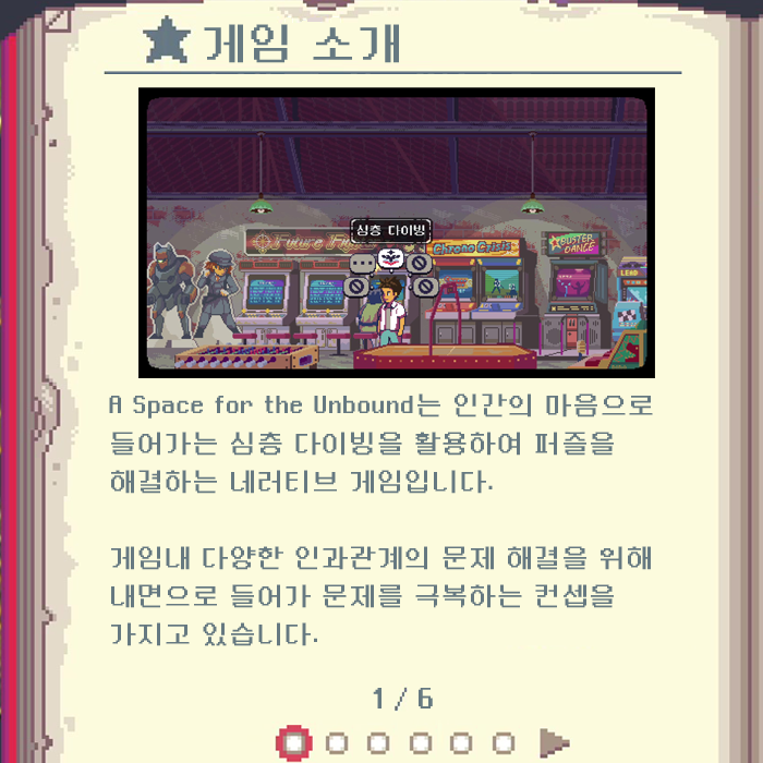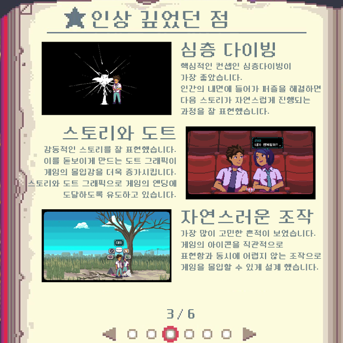 하지만 심층 다이빙의 레벨디자인 컨셉이 돋보였다는 점은 좋았습니다. 인간의 내면으로 들어가서 퍼즐을 해결하기 전에 밖으로 빠져나와 정보를 찾는 구조 자체는 저는 인상 깊은 컨셉이었다라고 말하고 싶습니다.