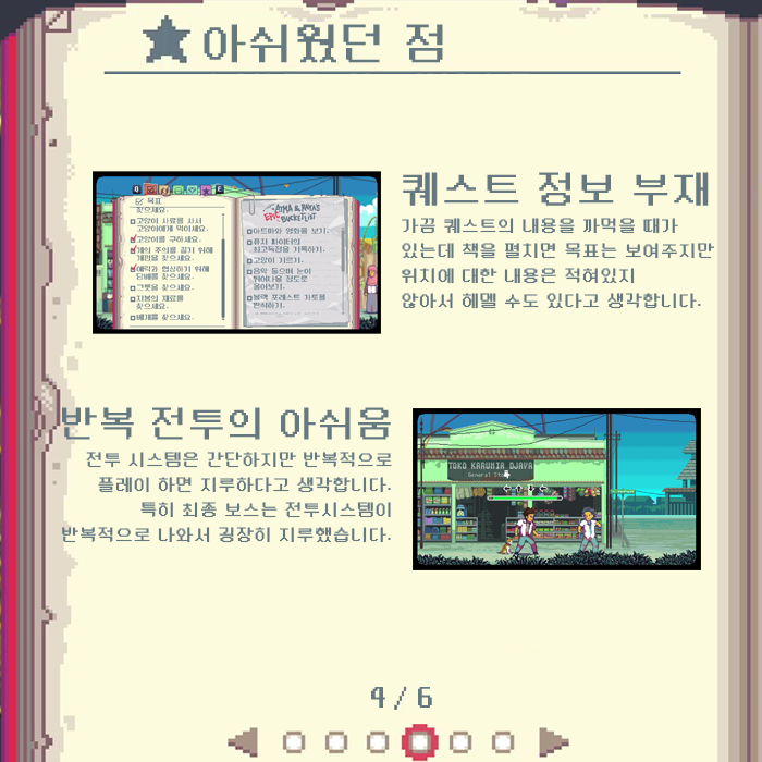 억지로 플레이 타임을 늘리는 듯한 느낌이 들지 않게끔 분량 조절을 했다면 더 좋지 않았을까 생각이 듭니다.