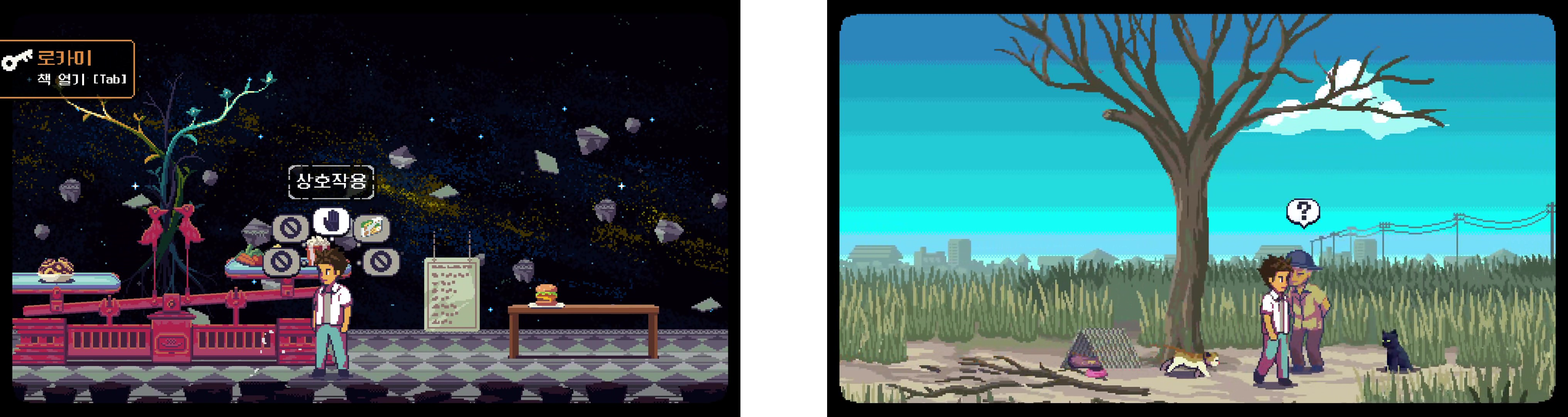 행동 관련 사항 리스트를 원형으로 표시하면서 상호작용의 선택지를 주는 표현이 자연스럽게 게임을 할 수 있도록 유도한 것처럼 보였습니다.