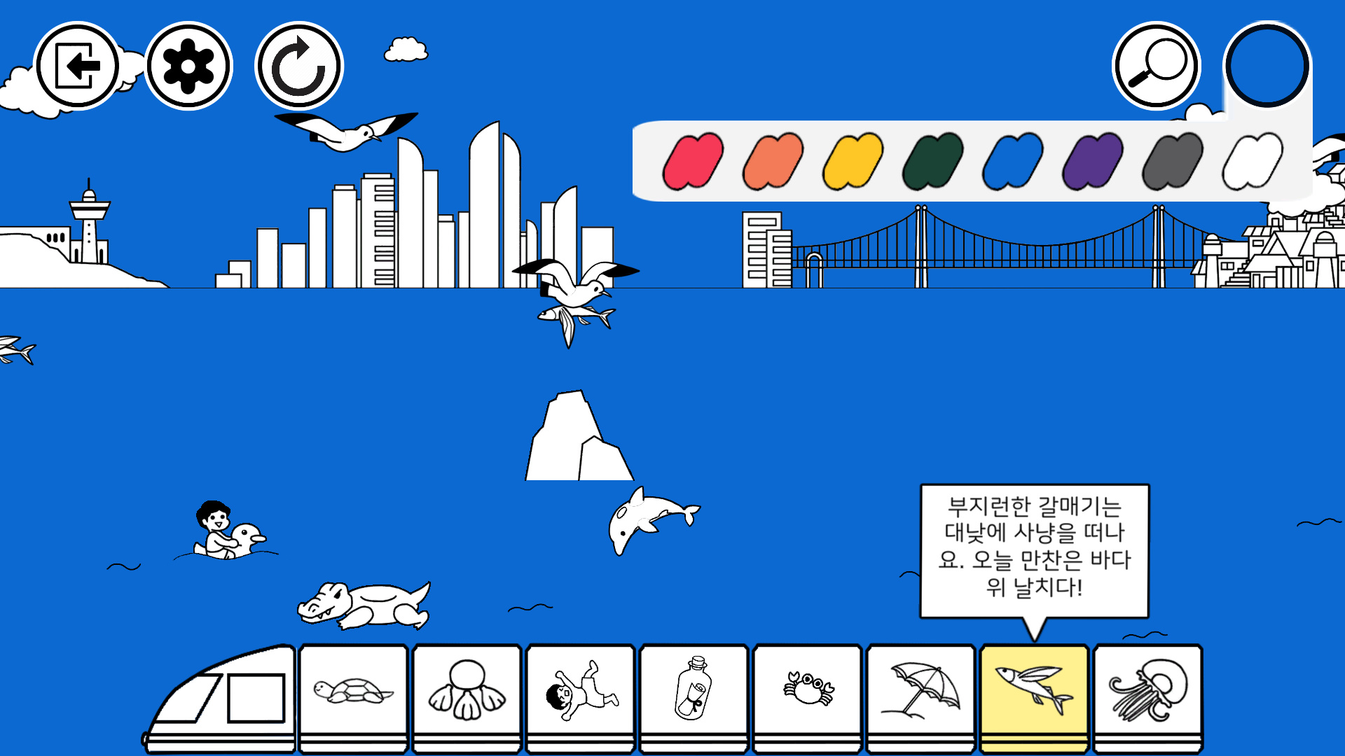 일단 돋보기 버튼을 누르면 힌트를 줍니다. 색깔을 클릭하고 사람, 건물, 나무, 물고기, 조개류등 여러 포인트 지점을 클릭하여