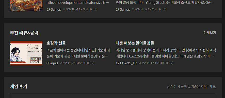 반면 이곳은 리뷰를 적기에 적당한 장소처럼 보입니다. 그런데 "리뷰&공략"이라는 개인적인 생각으로는 "전혀 다른 주제"를 같은 탭에서 다루는게 이상하기도 하고, 해당 게임을 구입한 사람이 아니라면 "게임 커뮤니티"에 접근성이 상당히 떨어집니다.