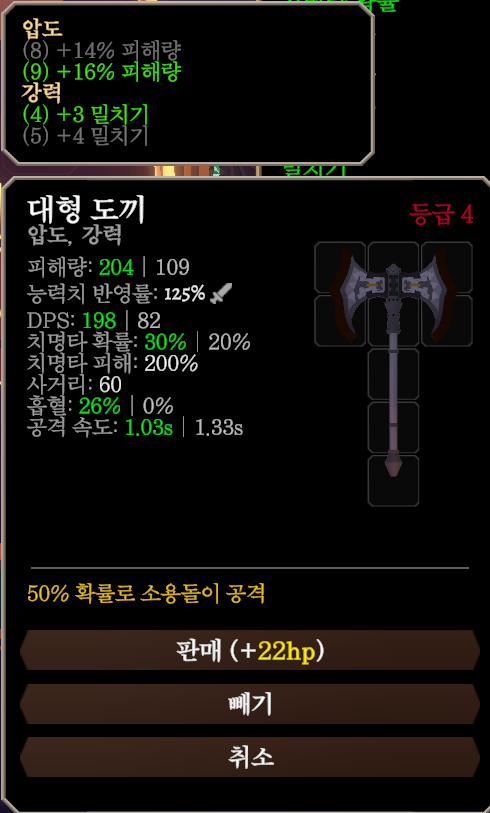 대검 옵션 중 압도가 겹치기에 부족한 데미지도 보완되고 부가 옵션인 50% 확률로 소용돌이가 사기