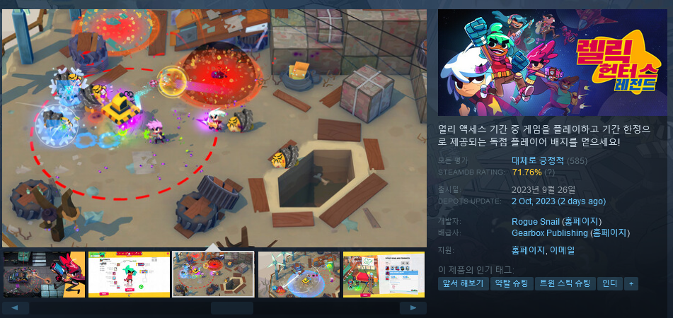 정식 출시 때 무료(부분 유료)로 전환되는 싱글 & 멀티 플레이 루트 슈터 게임입니다. 탑다운 슈팅 게임만 다년간 만들어온 개발사의 신작 입니다. 렐릭 헌터스라는 ip로 꾸준히 게임을 만들고 있습니다. 아직 얼리엑세스라 버그가 조금 있지만 저력이 느껴지는 게임성을 가지고 있습니다. 펀딩을 받아 제작에 들어간 게임 입니다.