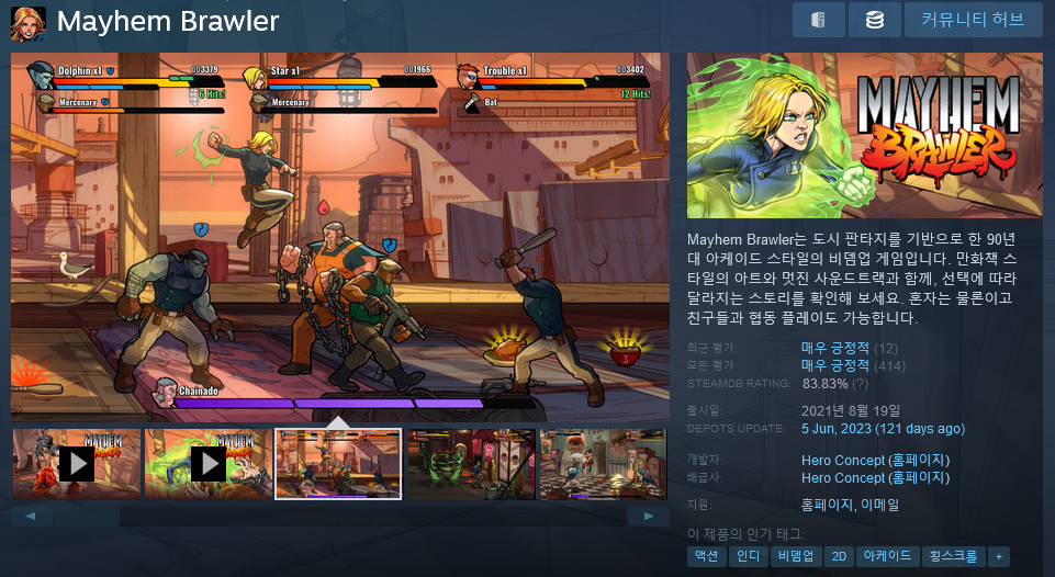 적을 띄운 후 화려한 공중 콤보를 간편하게 펼칠 수 있습니다. 프랑스 회사인데 현재 2편 제작 중 입니다. 최근까지 추가 캐릭터와 시스템을 열심히 업데이트를 해준 게임입니다. 증기에 있는 벨트 스크롤 게임 중 다섯 손가락 안에 들어가는 수작이라고 생각합니다. 1위는 물론 베어너클 4를 뽑습니다. 최근 닌자거북이 신작이 잘 나와서 취향에 따라 1~2위를 다툴 것 같네요.