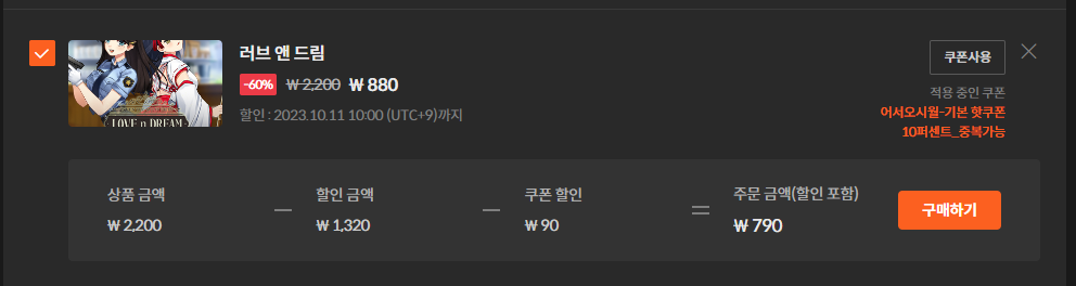 아직 2일 정도 여유가 있으니 할인 라인 다시 한번 보시고, 17% 쿠폰은 썼는데 10% 하나 부족하다 싶으면 이런식으로 투자하면 게임 하나 그냥 얻어 가는 거니까요