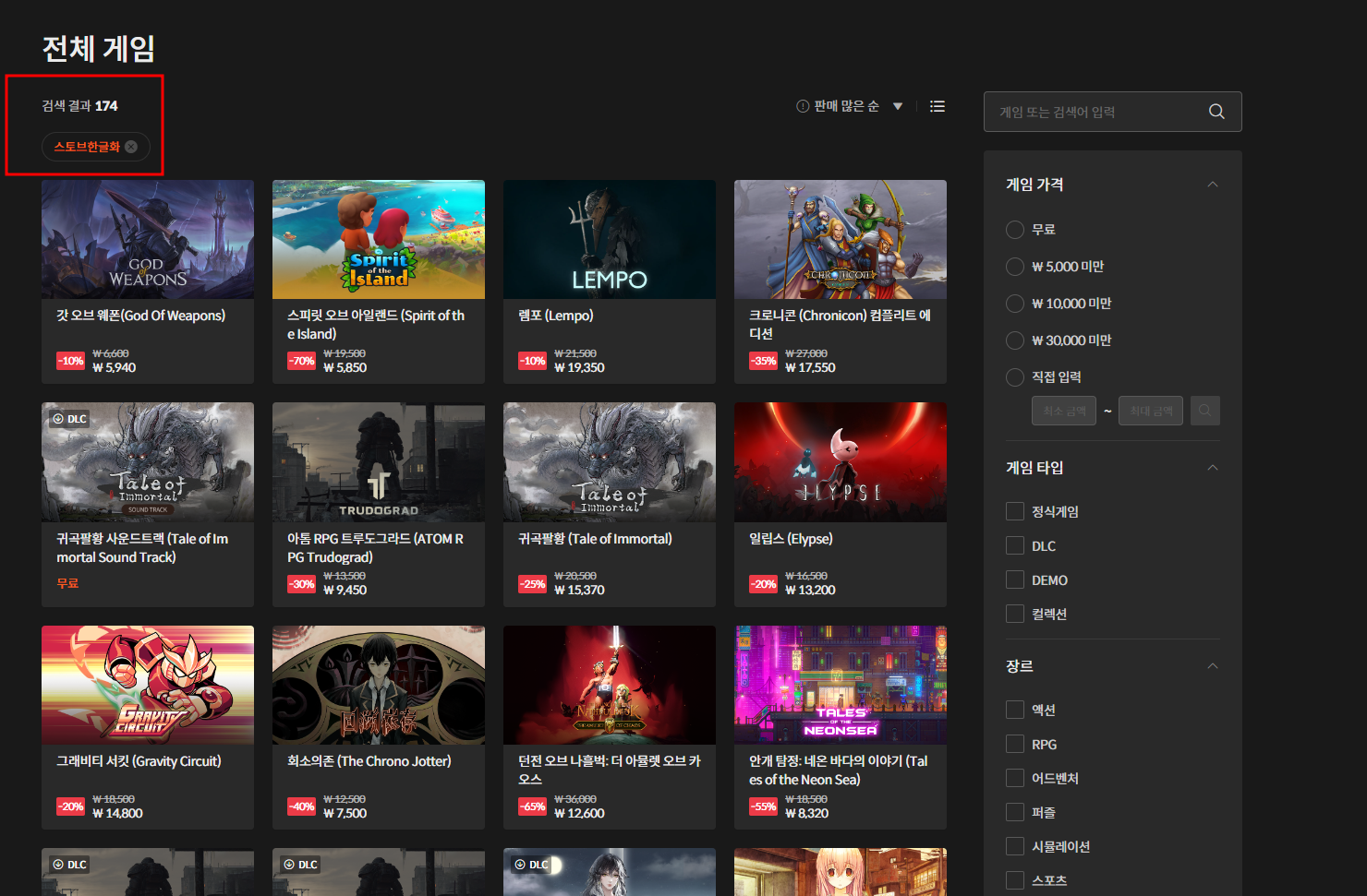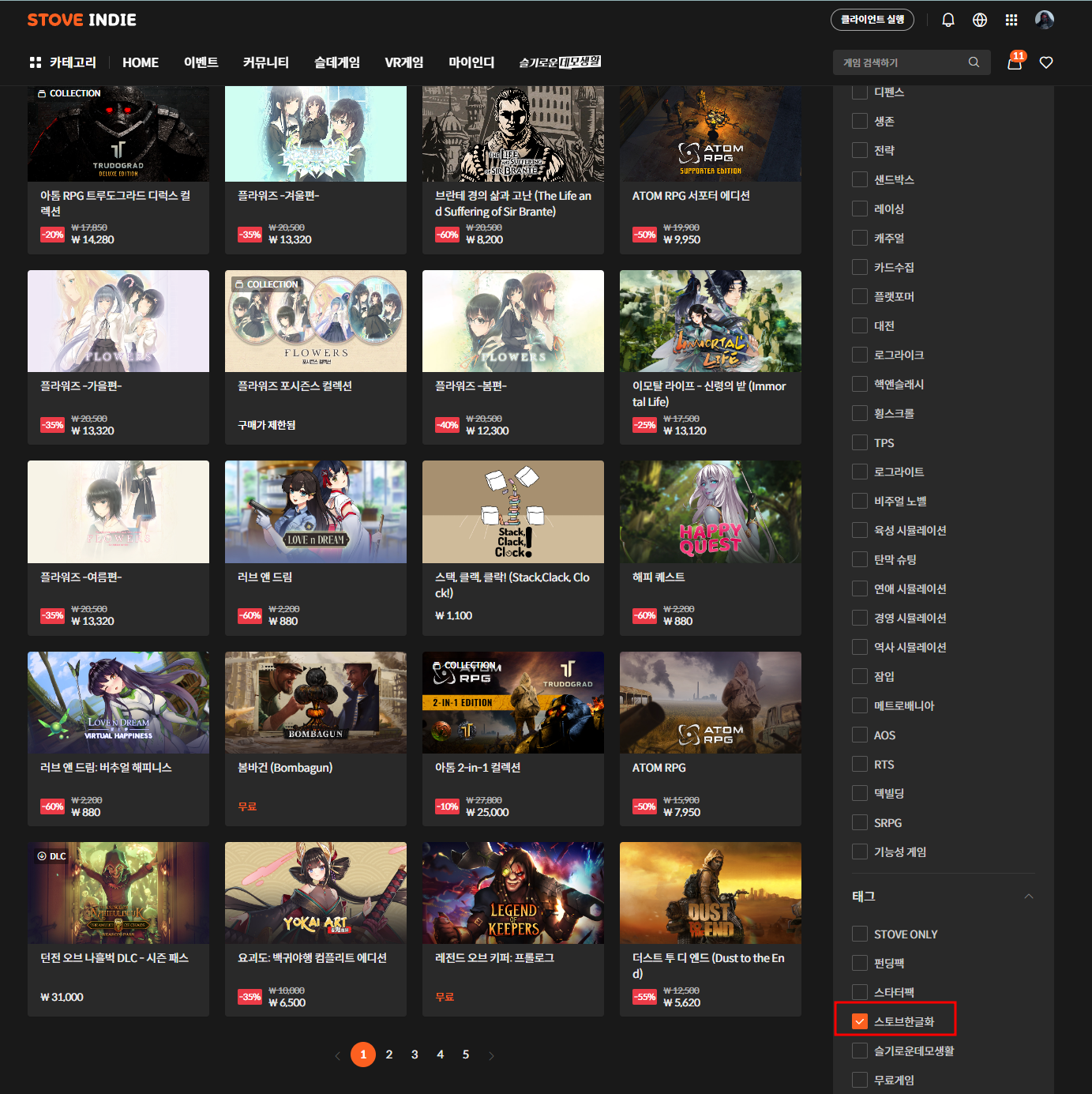 전체 게임 리스트에서 태그를 스토브 한글화를 선택하니까.