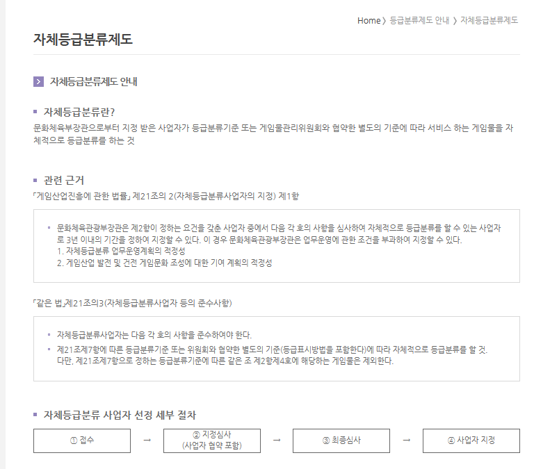 자체 등급 분류 제도 라고 해서 한국에서 게임을 서비스하는 플랫폼에게 게임을 심의할수 있는 권한을 주는 제도가 있습니다.