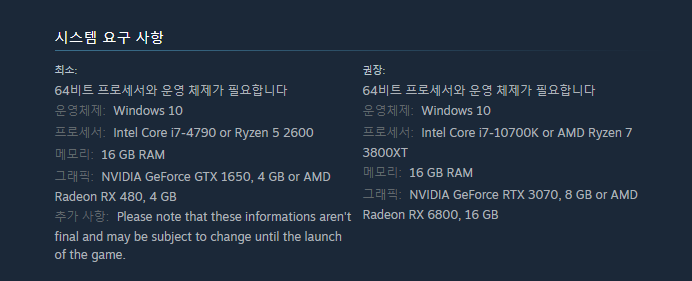 권장인 3070 이상으로 플레이 해본 건 아니지만 3060에서 이정도면 최적화가 잘 안 된거 같네요.