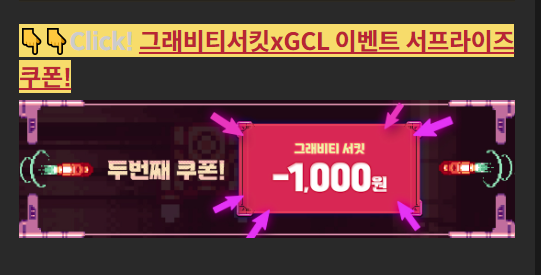 그래비티서킷xGCL 이벤트 서프라이즈 쿠폰 있던데. 이건 기간을 모르겠네요. 제가 일단 게임도 구매를 안해서...