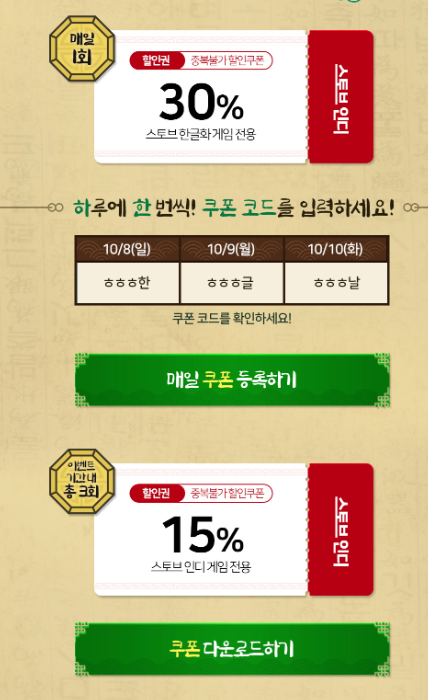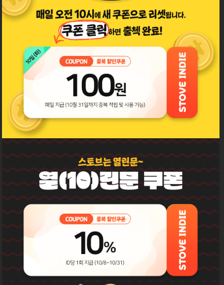 10월 10일 금일 30% 할인 쿠폰 챙기시고, 15% 할인 쿠폰도 챙겨가세요. (30% 쿠폰은 스토브 한글화 게임에만 적용 가능)