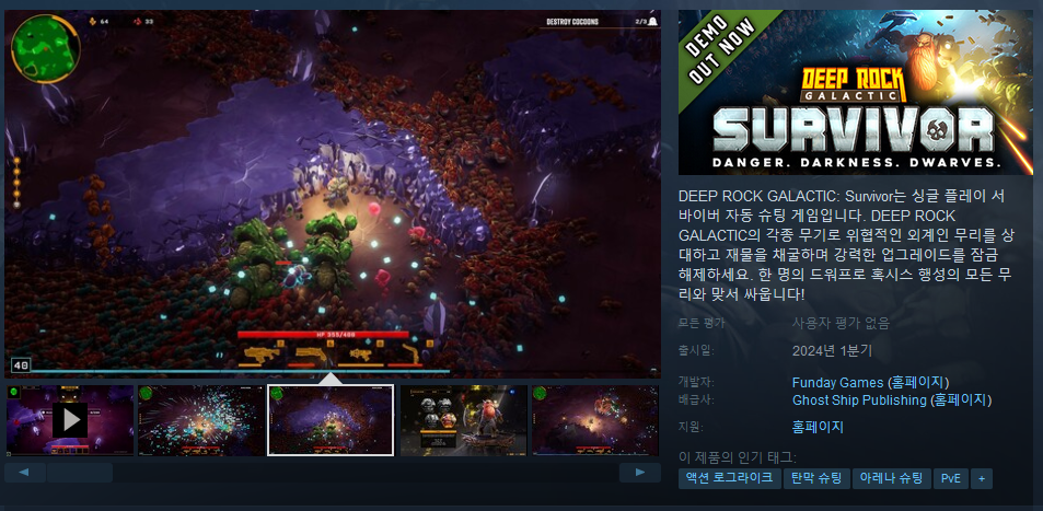 이 게임은 그 딥 락 갤럭틱을 뱀파이어 서바이버처럼 만든 게임입니다. 원본 게임의 특성상 주인공들이 우주 광부라 지형을 부수며 게임을 진행할 수 있습니다. 광물 채취를 해 업그레이드 재화를 얻을 수도 있죠. 자회사를 만들어서 이 게임을 새로 개발하기 시작했는데 이제 식상해지기 시작하던 뱀서류에 새 바람을 몰고 올 것 같습니다. 맛이 참 신선하고 찰집니다.