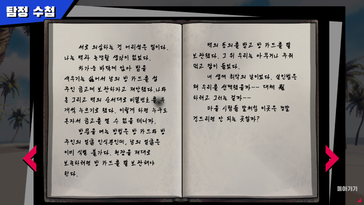 그 다음으로 뽑고 싶은거는 아무래도 추리물 느낌의 게임이다 보니 추리 난이도를 걱정하는 분을 많이 봤는데